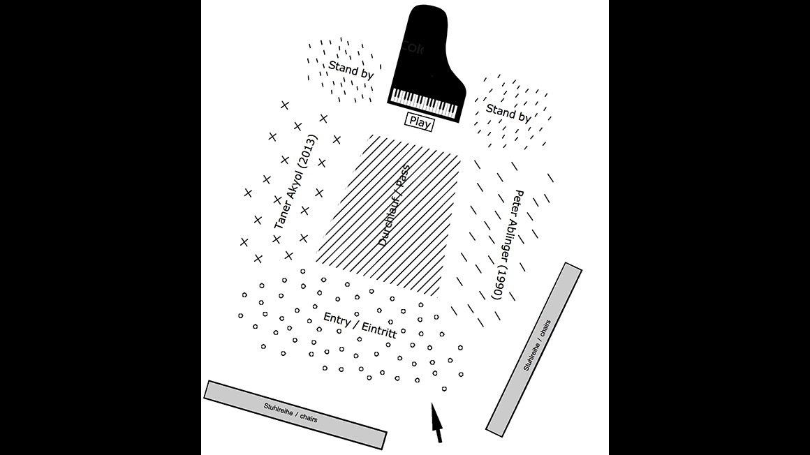 For the Klangwerkstatt anniversary there are included two compositions for piano (P.Ablinger: "Ohne Titel 1" from 1988/1990, T.Akyol "Roboski" from 2013) on the left and the right side of the interaction field which represent 25 years of the festival Klangwerkstatt Berlin. Instead of these other pieces can be used for future versions. |