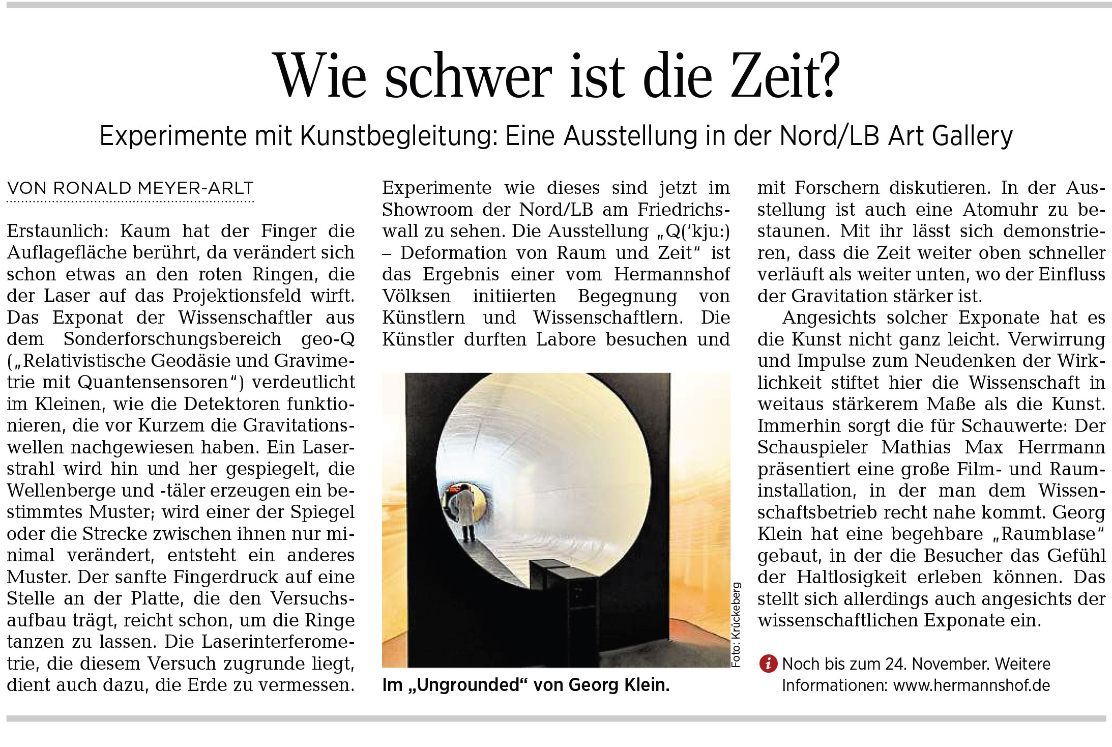 The radical challenge of the familiar vision of the world was the shock and fascination that Einstein triggered with his general theory of relativity a hundred years ago, and Heisenberg strengthened it somewhat later with his Uncertainty Principle. And a psychosocial moment is also decisive: the uncertainty, the vacillating ground, and the question of what I find to be in a completely relativistic space and time structure, which is concerned not only with physical measurements but with the present precarious feeling of life in our modern world - and to not unilaterally dissolve in rigid doctrines of faith. The accessible room bubble plays with a 'formless form' and gives the visitor a glance into a mirrored infinity. Spatial perception as well as time perception are challenged in an experimental constellation: like an elementary particle, the visitor moves on a laser-measured distance. Depending on how the visitor moves, a different animation is generated, a live-generated, individual version. The work of art is not fixed here as an absolute work, but it's dependent on the viewer as a relative work, whereby a basic knowledge of relativity can be experienced: the observer changes the observed through his observation. The content of the walkable path in the bubble is the relativity theory itself, in the form of Einstein's field equations, which were used to predict both, the 'black holes' and the 'gravitational waves' (which were first demonstrated experimentally, 100 years later, in coop. with the Albert Einstein Institute in Hanover). Hardly anyone knows Einstein's formula, which gave a completely new perspective on the relationship between space and time. On the interactive route, you walk almost through its formula, the spoken text. An audiovisual topography with merges time to space and space to time. At the end of the route, the visitor encounters Leibniz's question of all questions he has originally asked in French, but it appears here also in Italian (the language of Galileo), in English (Newton's language) and in German (Einstein's language), in the form of an audiovisual composition. 'What can we rely on when everything is relative, time and space, time and space, not comprehensible, unthinkable, and difficult to describe?" Georg Klein, in his work "ungrounded", converts this experience congenially. With headphones the visitor goes into this shapeless, labile space - a space bubble - moving between two mirrors, still blurred to the right and left the outer world, but the two mirrors, curved, expand the way to infinity. On the way text and sound of the 100-year-old Einstein field equation and of the 200-year eternally new multilingual question of Leibniz appears:''Pourquoi il ya plutôt quelque chose que rien?" From you as a viewer, the result is dependent on how the art appears. You can make space-time experiences in an artistic experiment arrangement. This convincing realization of Wittgenstein's: "Do not think, look" leads to a new dimension of communication between viewers and artists, between artists and scientists and all three.' (Prof. Wilfried Köpke) |