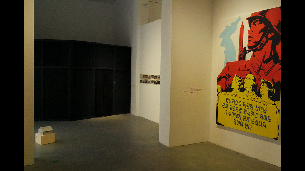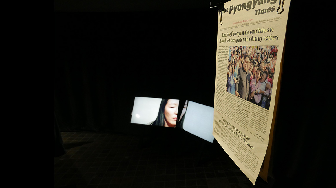With his installation Klein delivers a personal travelogue from audio, photos, blog-like video material and brought objects from North Korea, staged in a pentagonal, isolated chamber. The extreme tension that lay above this journey was not only incorporated in the "souvenirs" presented in a light, sound and video dramaturgy in the space, but also in a composition for the Korean national instrument Gayageum, the forms the subterranean soundtrack.